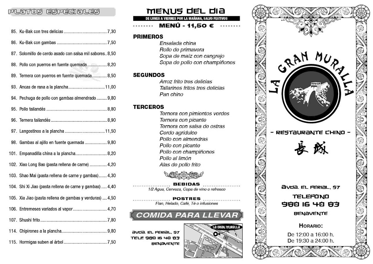 Introducing the menu at Restaurante Chino La Gran Muralla, located in the heart of Benavente, Spain, promises an enticing journey into Chinese cuisine. Known for its rich selection of traditional dishes, the menu features delightful options like gyōzas, rollitos (spring rolls), and arroz tres delicias (three delicacies rice), alongside flavorful mains such as spicy beef and almond chicken.